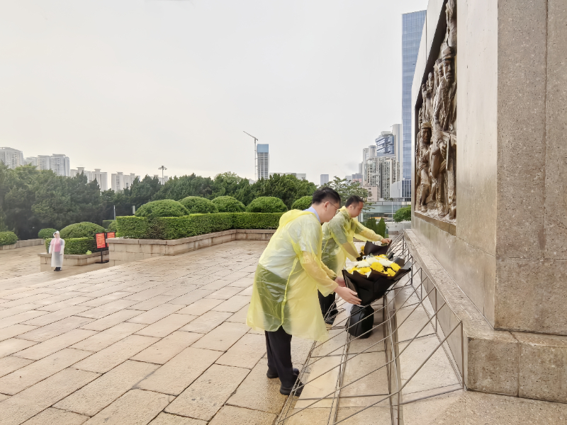 活动当天,细雨连绵,烈士陵园静谧肃穆,让巍峨的革命烈士纪念碑更显厚重。双方共同向先烈敬献花篮,以朵朵鲜花向革命先辈们表达致敬与缅怀。随后,全体人员整齐列队,低头默哀,并向革命烈士纪念碑深深鞠躬,愿忠骨长存、英魂永驻。