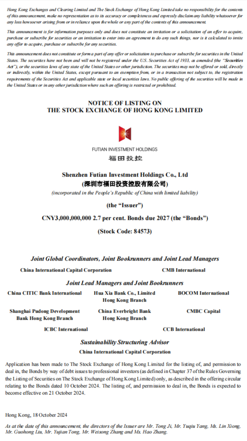 永利yl2341130亿元境外债券上市公告Formal Notice