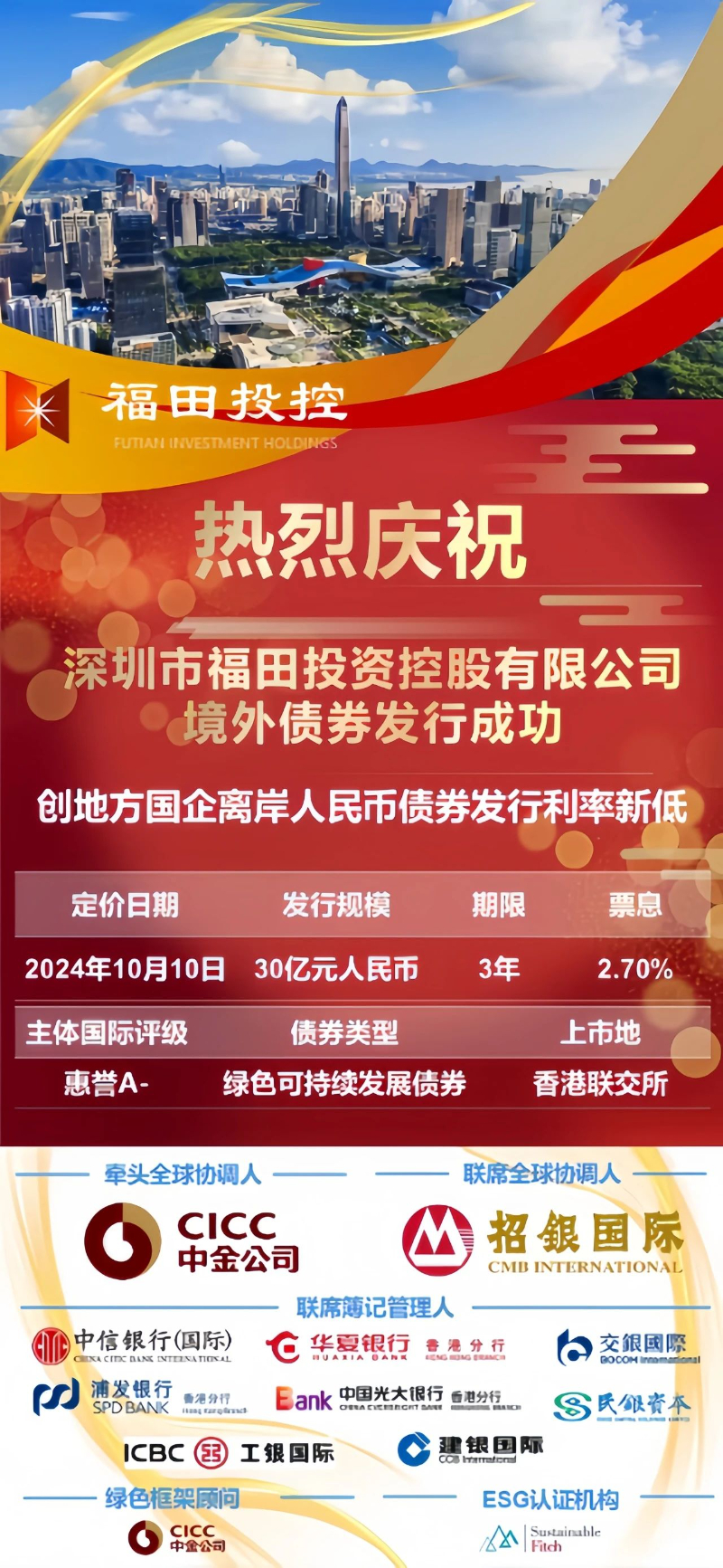 2024年10月10日,深圳市福田投资控股有限公司(简称“永利yl23411”)在香港成功定价30亿元绿色可持续发展离岸人民币债券,票面利率2.7%,创全国地方国有企业离岸人民币债券新低。此次发行备受国际资本市场瞩目,订单峰值超过60亿元。