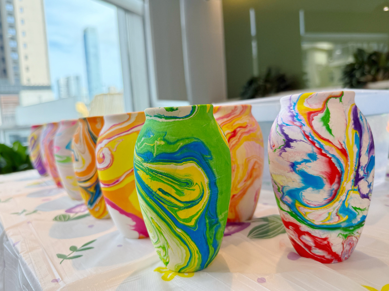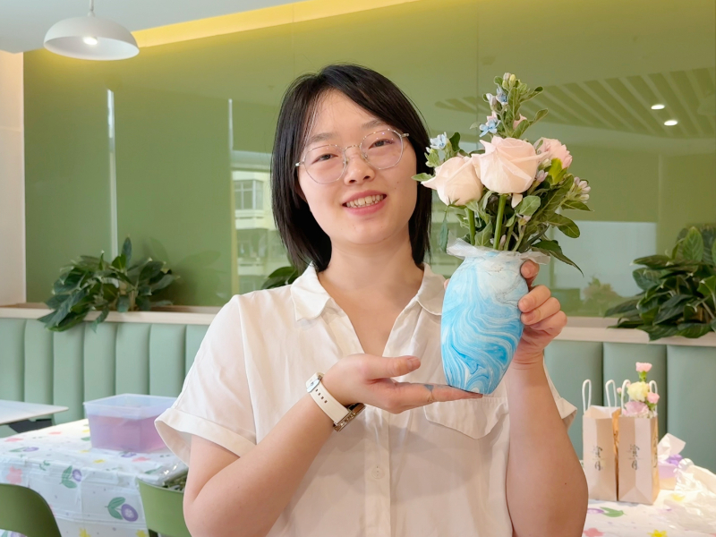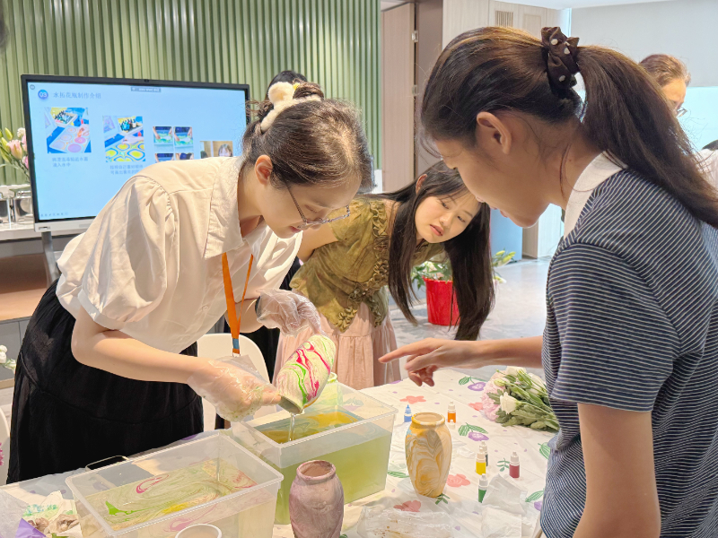 活动现场,大家尽情发挥想象,选择颜料滴入水中,再用工具拨弄成绚烂多彩的纹样。随后,将提前烧制好的花瓶浸入水中并捞出,一个个独具特色的水拓花瓶就诞生了。