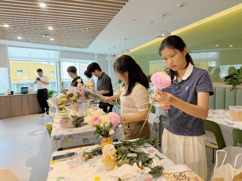 大家在老师的悉心指导下,挑选心仪的花材进行修剪、搭配,用百合、洋桔梗、牡丹菊等装点水拓花瓶,创作出属于自己的“花样”小世界。